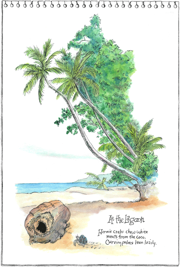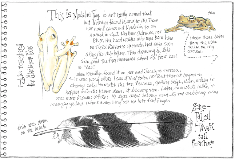 The journal and sketches celebrate the jungle, the leaf-cutter ants, huge-billed toucans, skittery lizards, raucous parrots and macaws, chameleon frogs, turtle-egg-thieving coatis, and