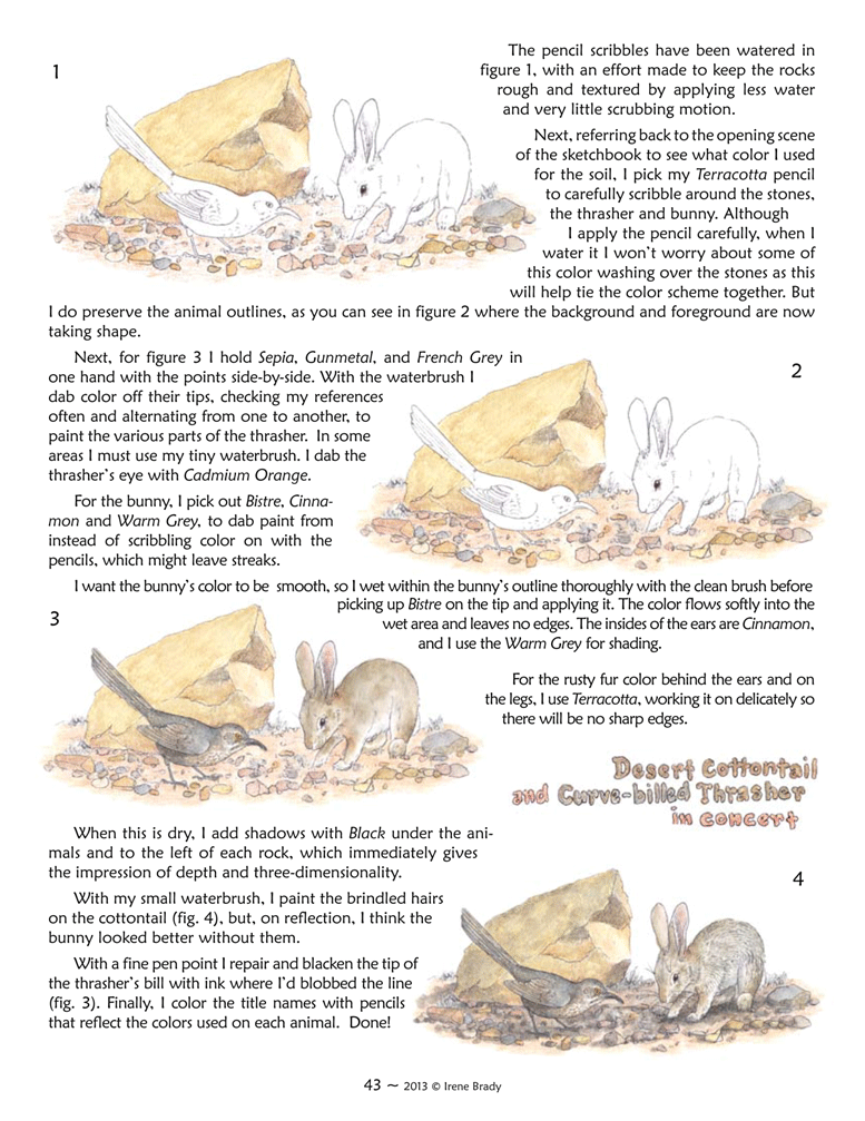 The cottontail and thrasher tutorial is only three pages long, beginning (as they all do) with a page showing the sketch before and after color was added. If you print out that page on heavy paper, you can actually paint right on the lower image (like a coloring book page), applying colors to it as you follow the tutorial. The finished painting is at the top so that you can see your final goal as you work.